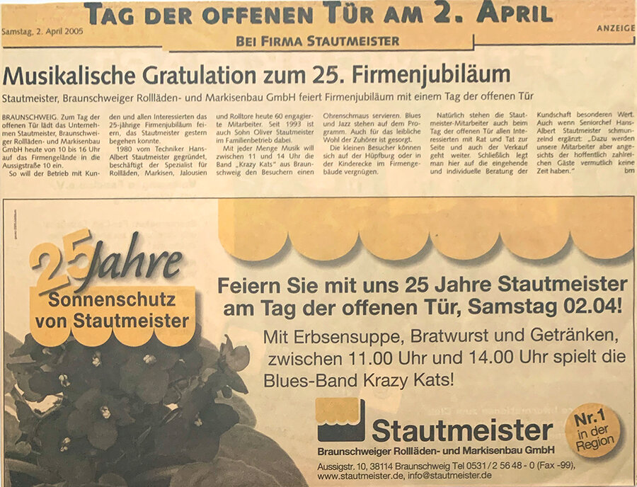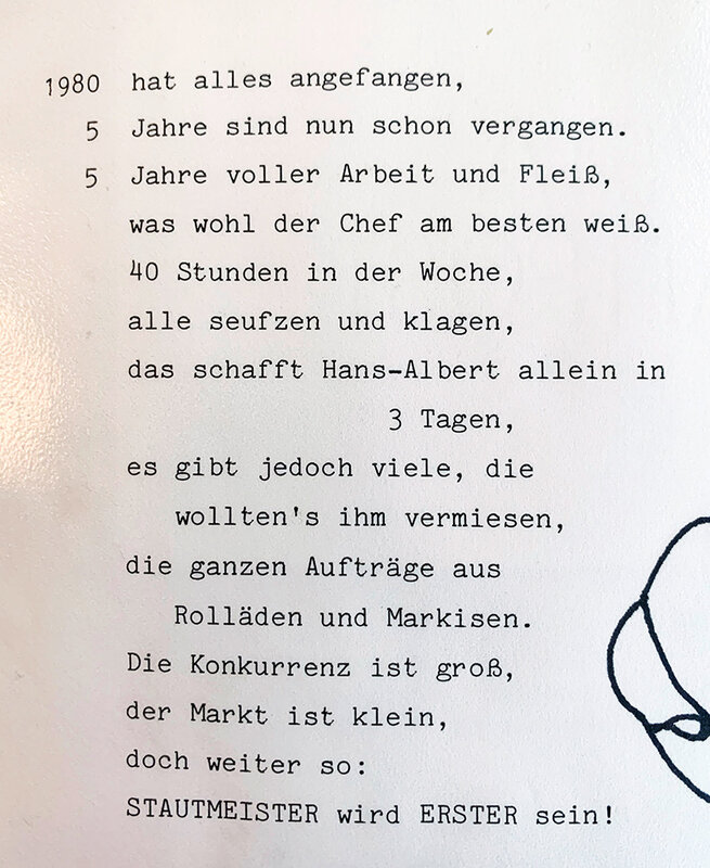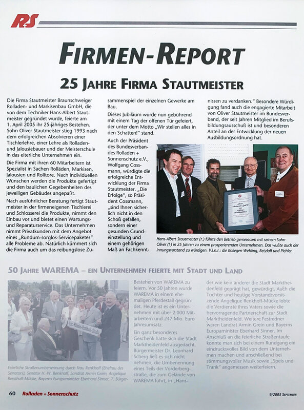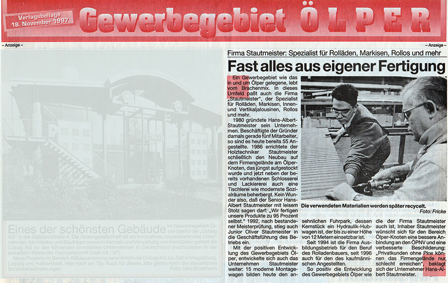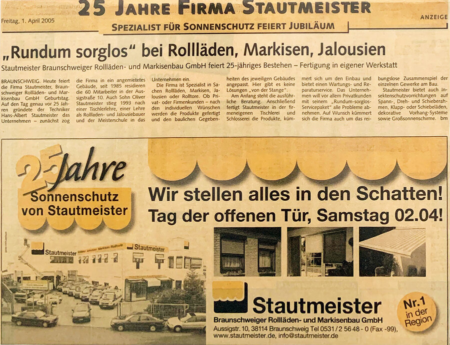 Am 01. März 1980 ist es soweit: Hans-Albert Stautmeister eröffnet seinen Rollladenfachbetrieb auf dem Gelände der ehemaligen Beton- und Monierbau AG an der Gifhorner Straße 28 in Braunschweig. Dort fertigt er in einer 600 qm großen Halle Rollläden und Sonnenschutzanlagen.