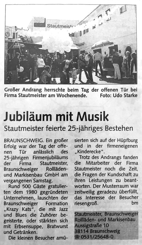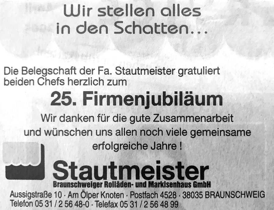 Es wurden regelmäßig Anzeigen in den verschiedensten regionalen Medien geschaltet. Im November erschien eine Verlagsbeilage der Braunschweiger Zeitung zum Gewerbegebiet Ölper, in der auch ein Artikel über Stautmeister abgedruckt war.
