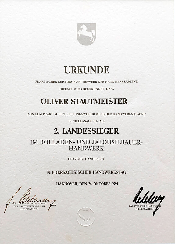 Anfang 2025 hat Tom Stautmeister als dritte Generation im Unternehmen die Meisterprüfung im Rollladen- und Sonnenschutztechnikerhandwerk erfolgreich in Wiesbaden abgeschlossen.